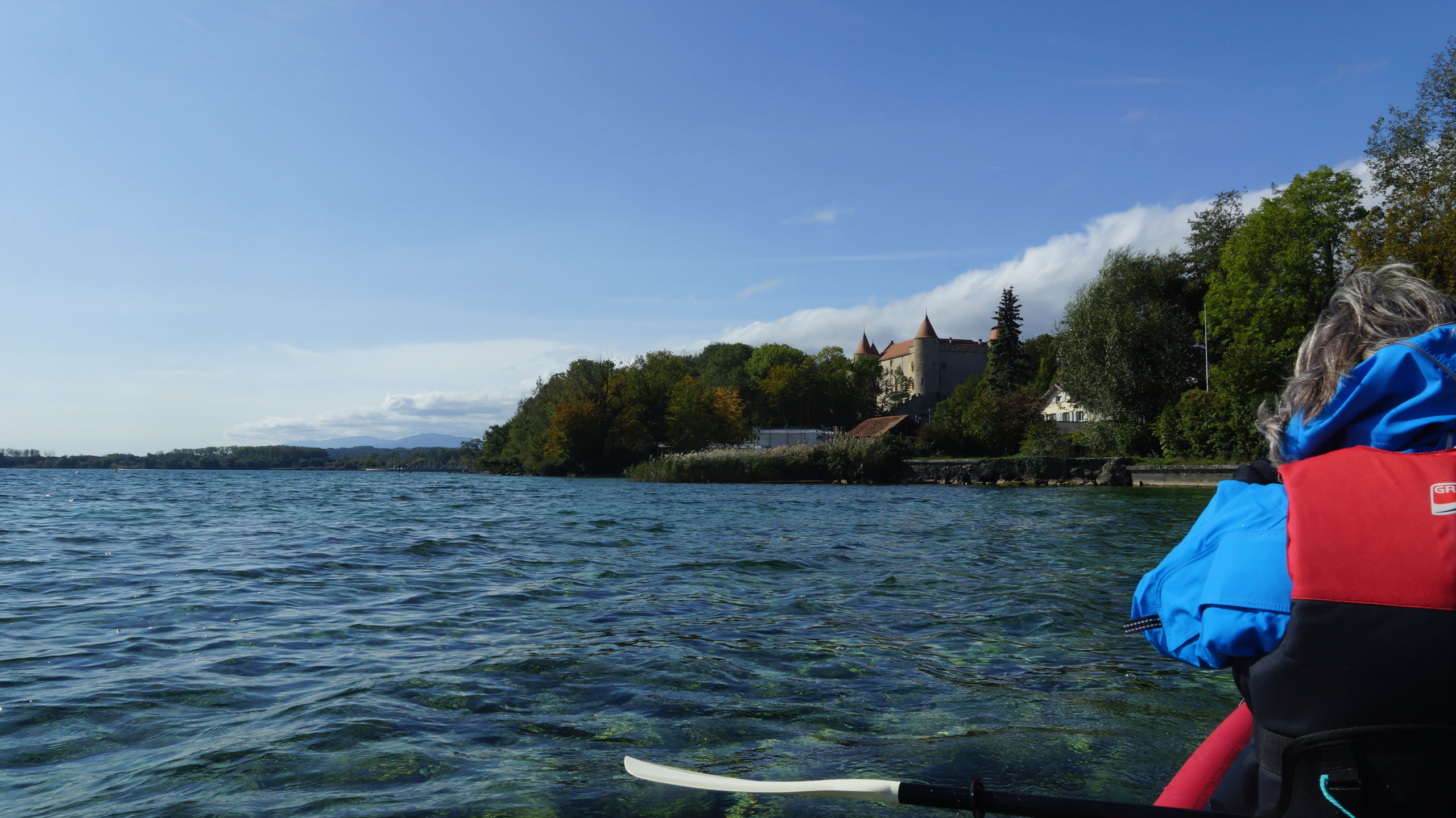 Pause nach der überquerung des Neuenburgersee mit dem Row on Air Kayak